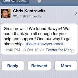 Texte de l'image : "Bonnes nouvelles !!! Nous avons trouvé Sawyer ! Nous ne pouvons pas vous remercier assez pour votre aide et soutient ! Sur notre chemin pour lui obtenir une frite. #Amour #SawyerEstDeRetour"