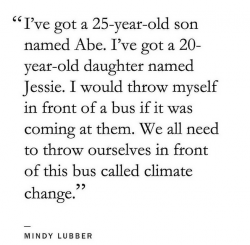 Texte de l'image : "J'ai un fils de 25 ans nommé Abe. J'ai une fille de 20 ans nommée Jessie. Je me jetterais moi-même devant un bus si il arriverait vers eux. Nous avons tous besoin de nous jeter devant ce bus appelé changement climatique. - Mindy Lubber"
